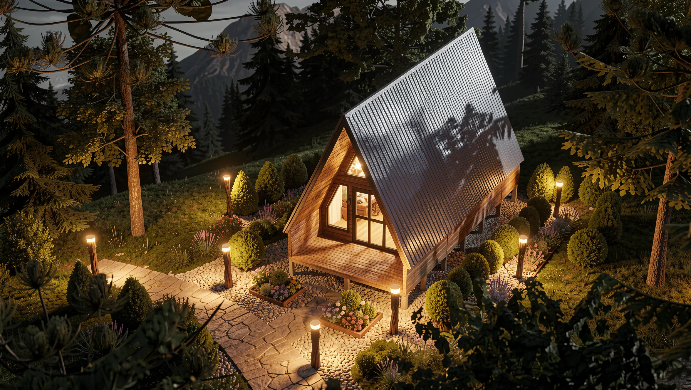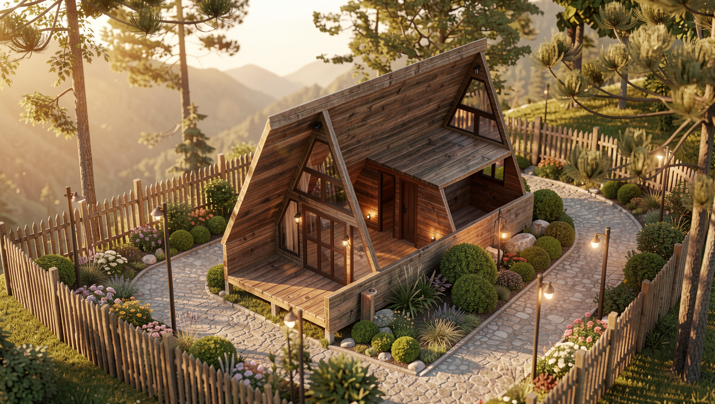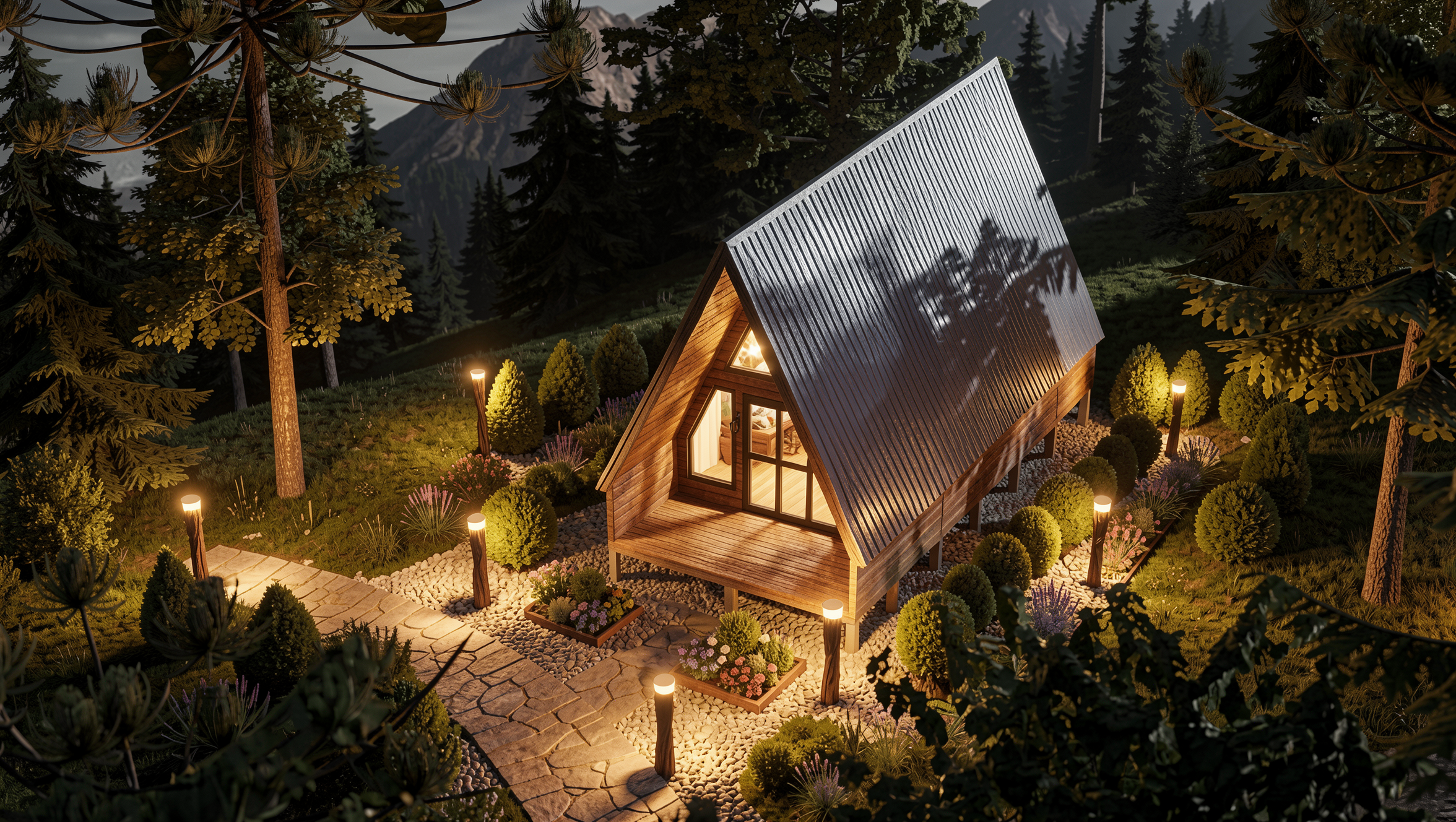 Seguindo a essência dos modelos cabana, as paredes laterais proporcionam maior volume interno e altura útil, criando uma sensação de amplitude superior e permitindo a construção de um mezanino ainda mais generoso e funcional. Esse ganho de espaço transforma o chalé em uma solução mais confortável tanto para estadias curtas quanto para uso contínuo.