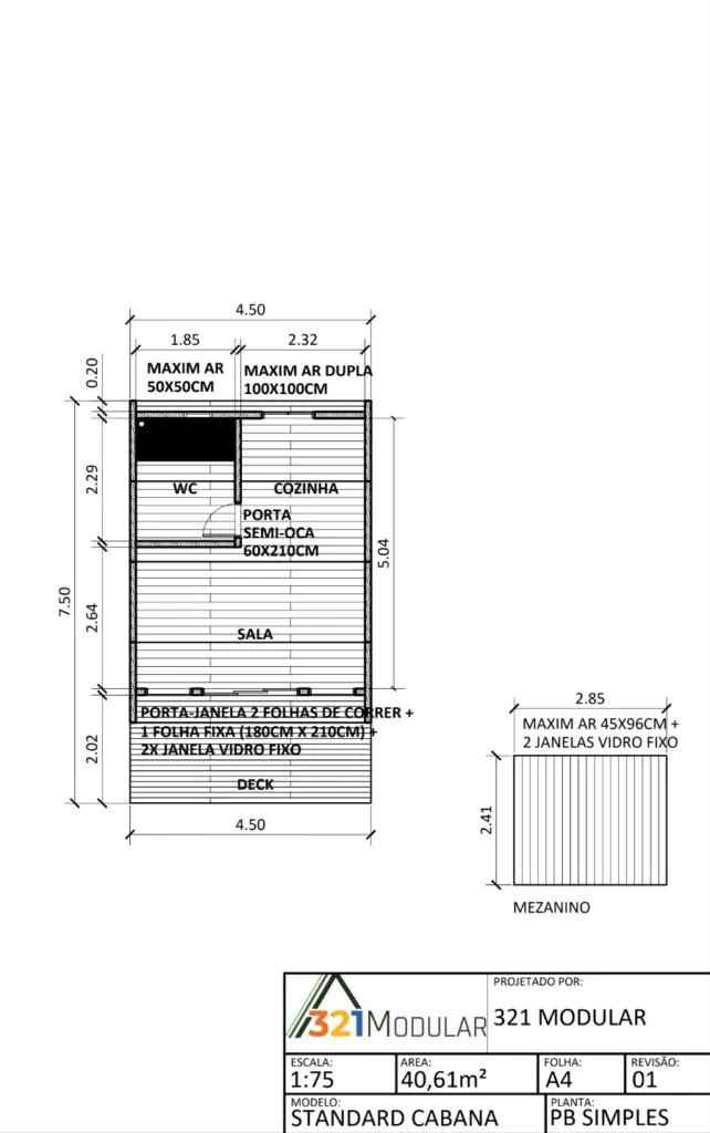 O Chalé Cabana Standard é a evolução natural dos modelos compactos, trazendo mais amplitude interna sem abrir mão da eficiência construtiva. Com 40,60m² de área total, este projeto se destaca pela presença de paredes laterais, que proporcionam maior altura útil e ampliam significativamente a sensação de espaço.