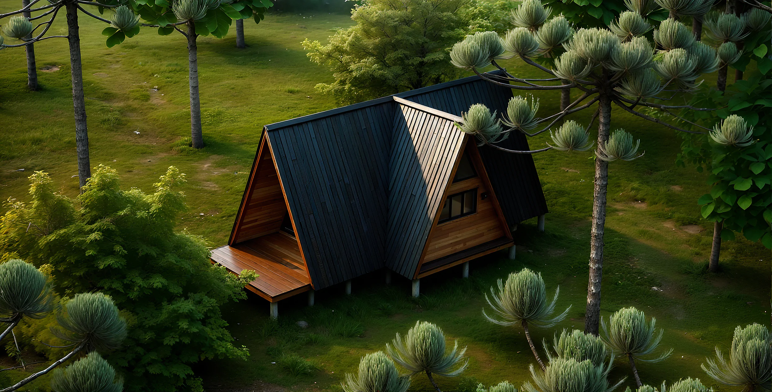 Sua estrutura é composta por madeira de pinus autoclavada e selecionada, com tratamento industrial contra cupins e apodrecimento, garantindo durabilidade e resistência. Todas as paredes são duplas e revestidas em ambas as faces, com tubulações e instalações elétricas embutidas. O banheiro recebe revestimento em laminado de fibra de vidro. A cobertura é composta por telhas trapezoidais de aluzinco com pintura eletrostática e EPS de 32mm, oferecendo conforto térmico e acústico. As esquadrias em eucalipto maciço completam o acabamento natural e sofisticado.