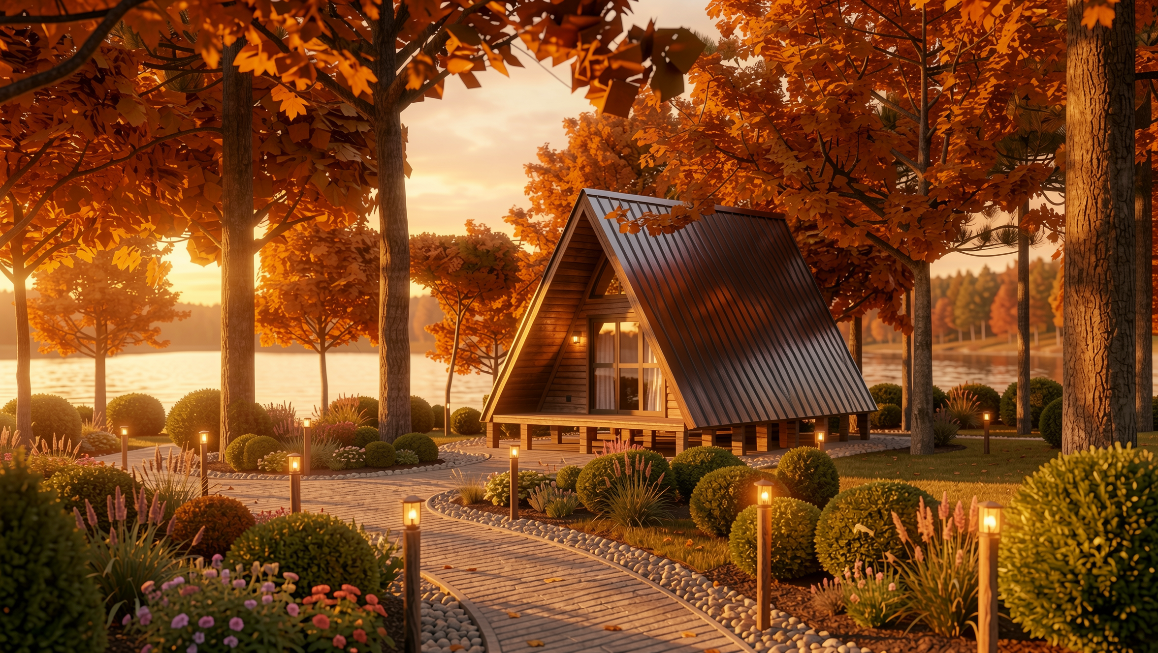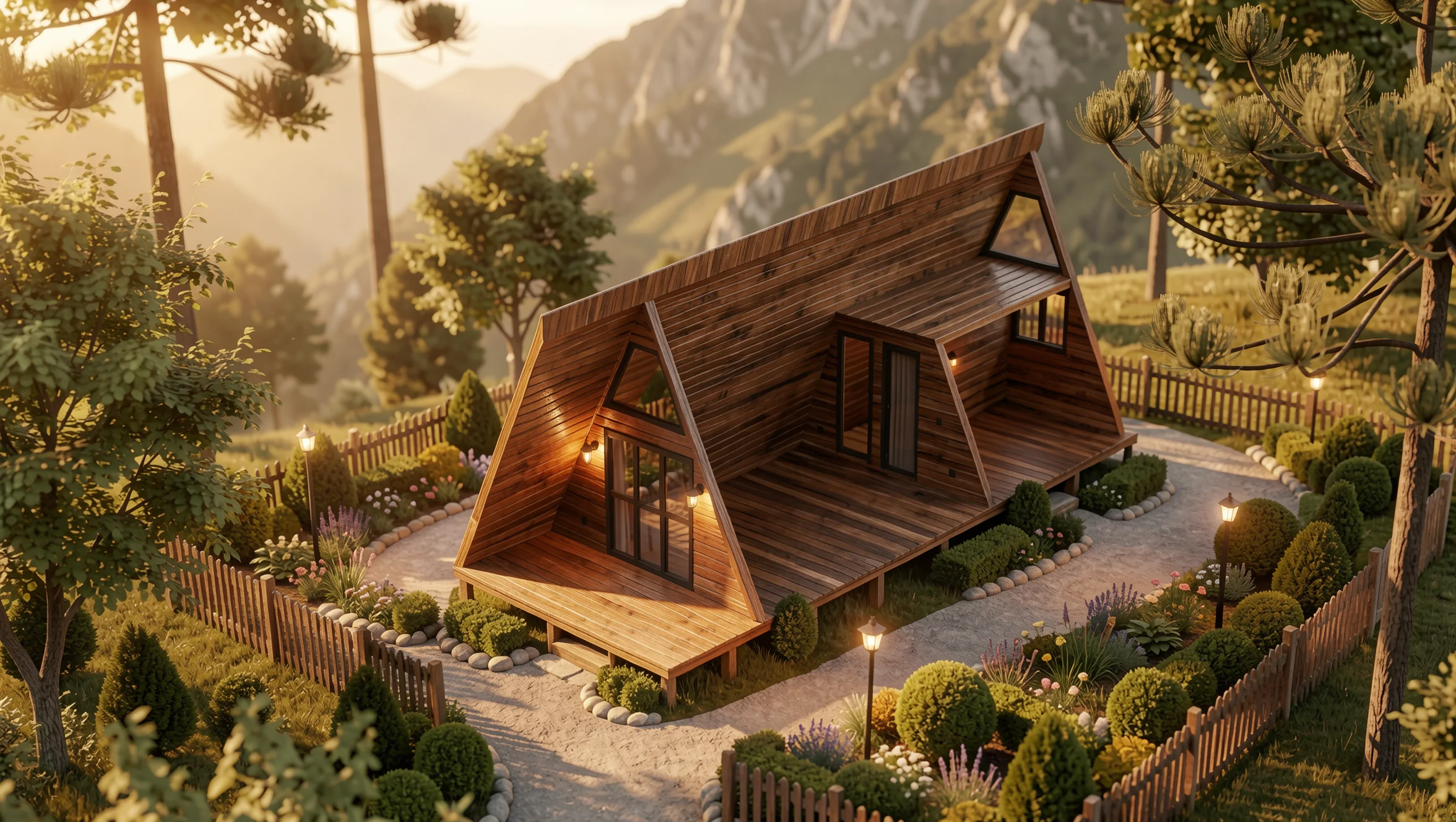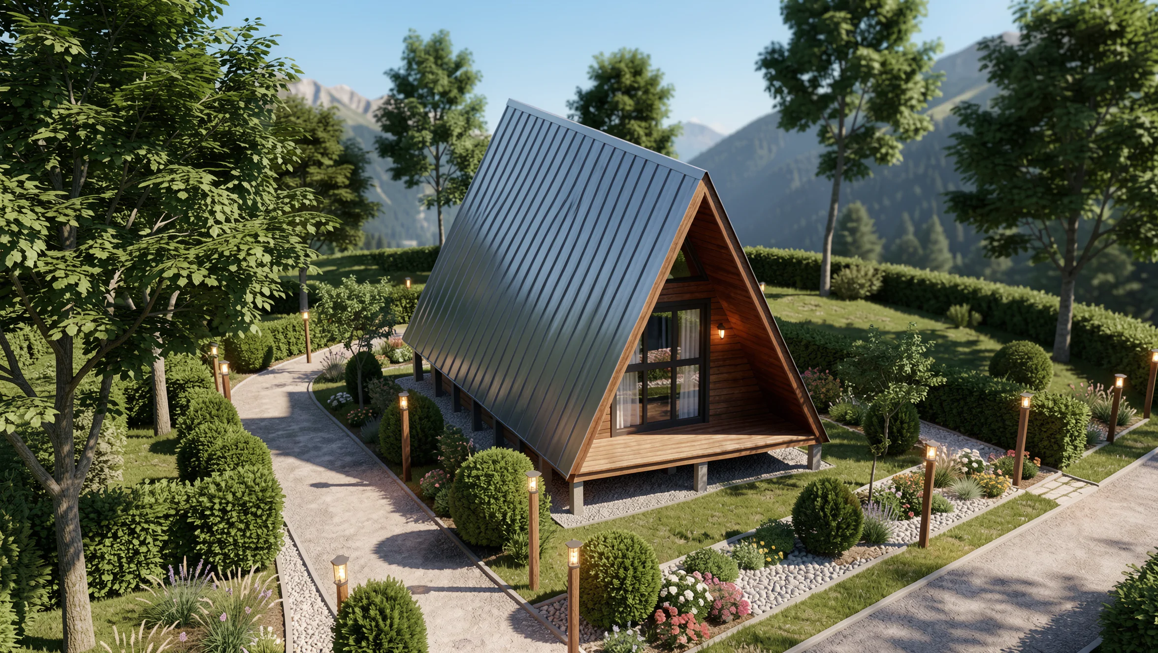 Mantendo os diferenciais da linha, o modelo conta com mezanino espaçoso, organização inteligente dos ambientes e a estética marcante do estilo A-frame, que alia design contemporâneo à robustez estrutural.
