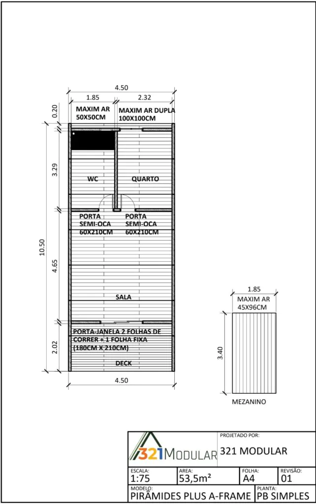 O Chalé Modelo 04A é a evolução do modelo já consagrado, trazendo mais espaço interno e uma experiência ainda mais confortável sem perder a essência de eficiência e inteligência construtiva. Com 53,5m² de área total, este projeto amplia as possibilidades de uso, tornando os ambientes mais generosos e funcionais.